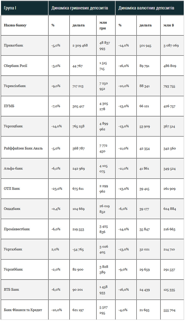 У першій групі банків найбільший відтік депозитів відбувся у «Приватбанку»: вкладники винесли півмільярда доларів та 2,3 млрд грн. «Сбербанк Росії» втратив у валюті $90 млн, у гривні - 44 млн.
