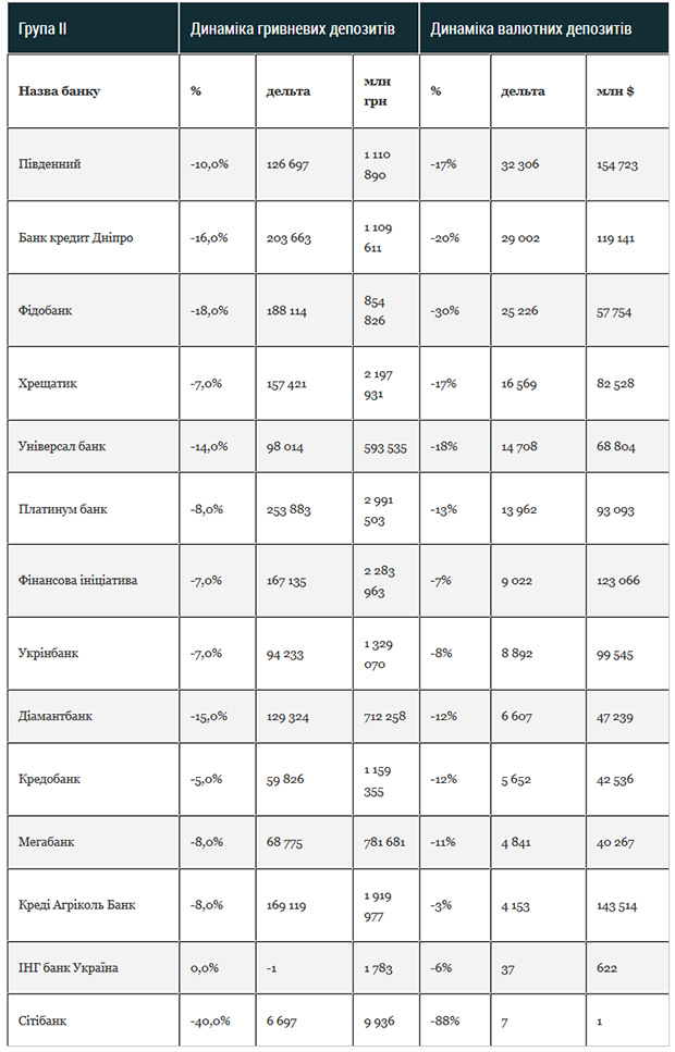 Відтік валютних і гривневих депозитів фізичних осіб відбувся у всій другій групі.