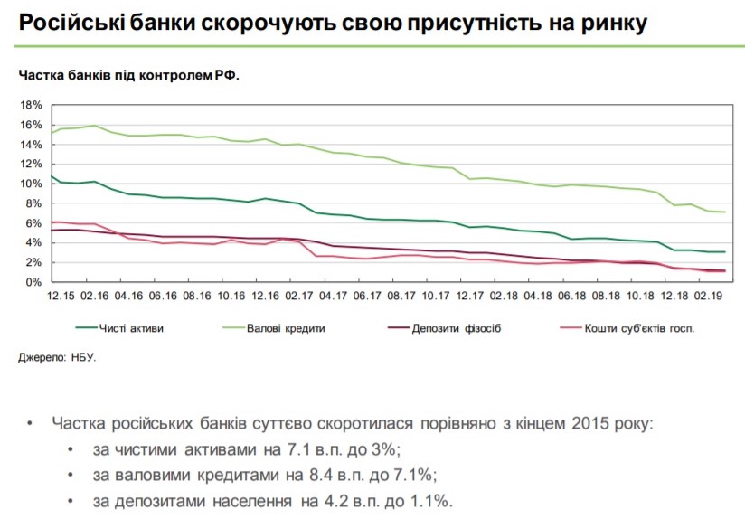 Частка російських банків на кінець І кварталу 2019 року порівняно з кінцем 2015 року за чистими активами впала на 7,1 в.п. - до 3%.