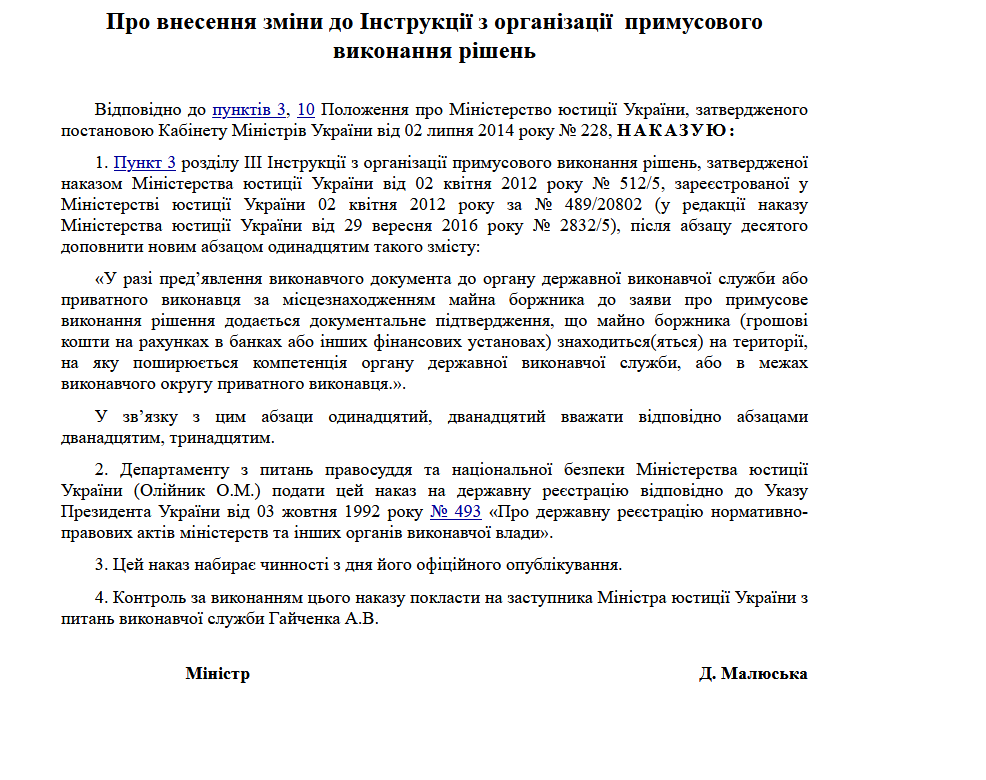 Міністерство юстиції внесло зміни до Інструкції з організації примусового виконання рішень від 2 квітня 2012 року №512/5.