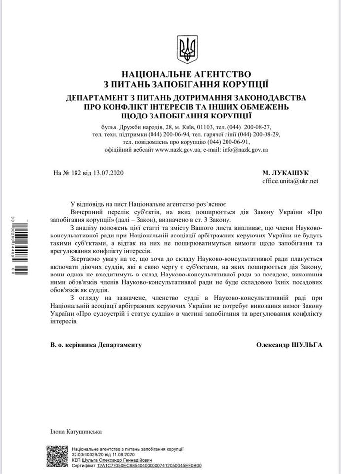 Національне агентство з питань запобігання корупції не вбачає конфлікту інтересів в тому, щоб діючі судді входили до складу Науково-консультативної ради при Національній асоціації арбітражних керуючих.