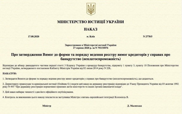 Згідно відомостей Єдиного державного реєстру нормативно-правових актів, вже у п'ятницю, 28 серпня 2020 року, набирає чинності Наказ Міністерства юстиції України №2778/5 від 17.08.2020 року "Про затвердження Вимог до форми та порядку ведення реєстру вимог кредиторів у справах про банкрутство (неплатоспроможність)".