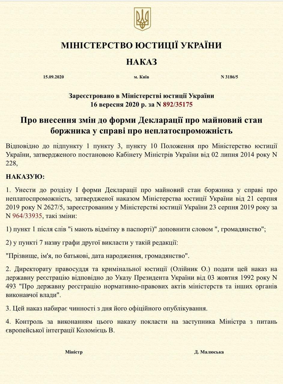 Згідно відомостей Єдиного державного реєстру нормативно-правових актів, 29 вересня 2020 року набирають чинності зміни до Форми декаларації про майновий стан боржника у справі про неплатоспроможність, затверджені Наказом Міністерства юстиції України від 16.09.2020 року №3186/5: