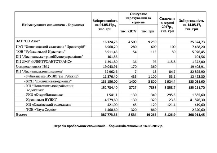 АТ «СО «Азот» є найбільшим боржником Луганщини, що вже винне Луганському енергетичному об'єднанню за поставлену електроенергію більше 25 млн гривень.