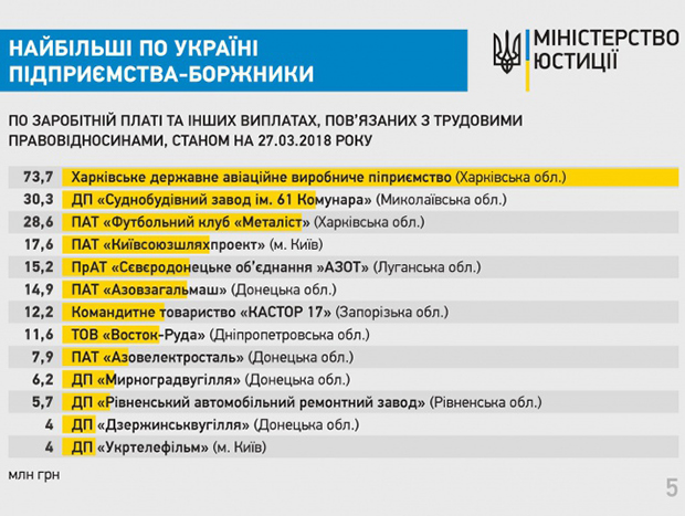 У рамках проведення кампанії з примусового стягнення заборгованості з виплати заробітної плати Міністерство юстиції створило антирейтинг найбільших підприємств-боржників по заробітній платі та інших виплатах, пов’язаних з трудовими правовідносинами.